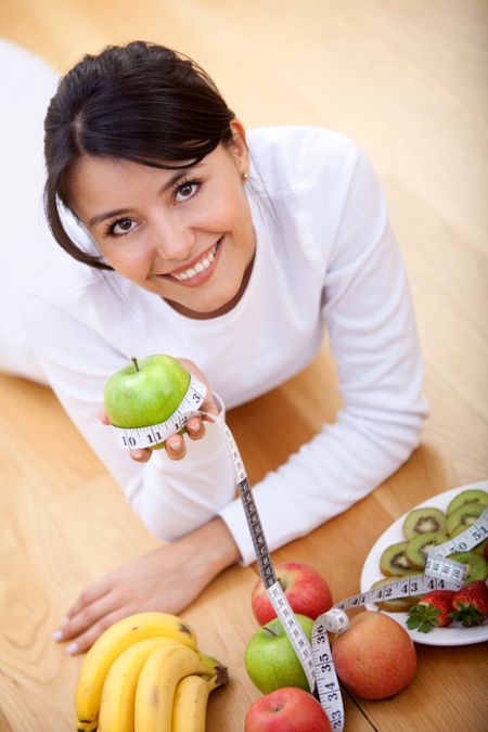 Healthy eating woman lying on the floor with fruits