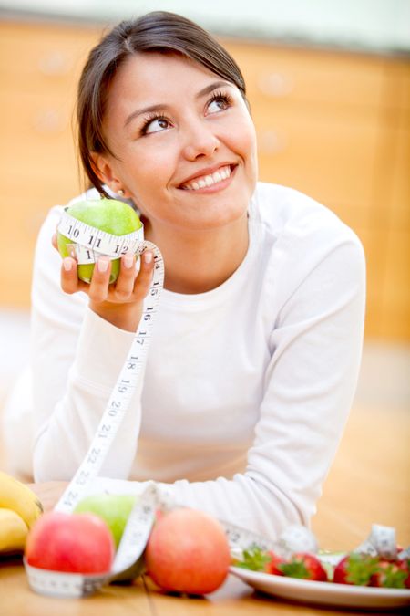 Healthy eating woman thinking about eating an apple