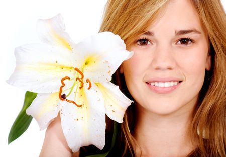 healthy girl smiling portrait holding a lily flower next to her face - isolated over a white background