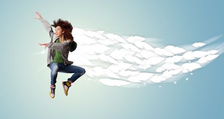 Healthy young woman jumping with feathers around her concept on bright background