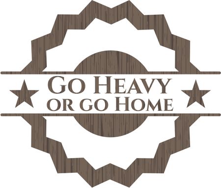 Go Heavy or go Home badge with wooden background