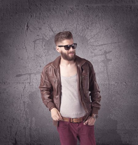 A hipster fashion model guy in casual clothing stnading with mobile phone in front of concrete urban wall background concept