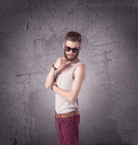 A hipster fashion model guy in casual clothing stnading with mobile phone in front of concrete urban wall background concept