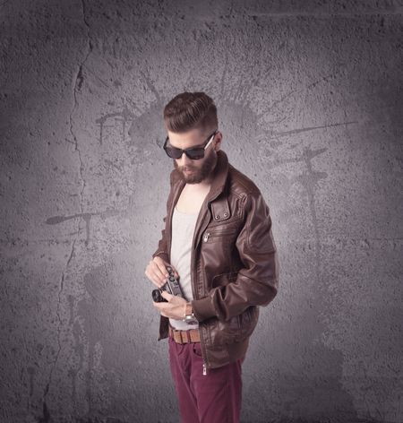 A hipster fashion model guy in casual clothing stnading with mobile phone in front of concrete urban wall background concept