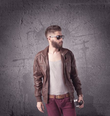 A hipster fashion model guy in casual clothing stnading with mobile phone in front of concrete urban wall background concept