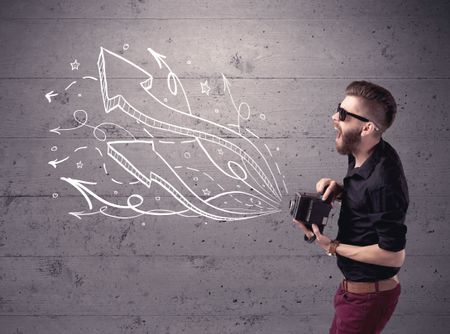 A hipster guy opening his point of view through looking a vintage camera concept with illustratied drawn arrows on urban wall