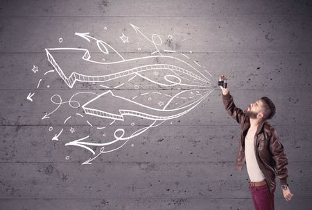A hipster guy opening his point of view through looking a vintage camera concept with illustratied drawn arrows on urban wall