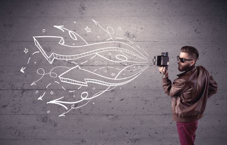 A hipster guy opening his point of view through looking a vintage camera concept with illustratied drawn arrows on urban wall
