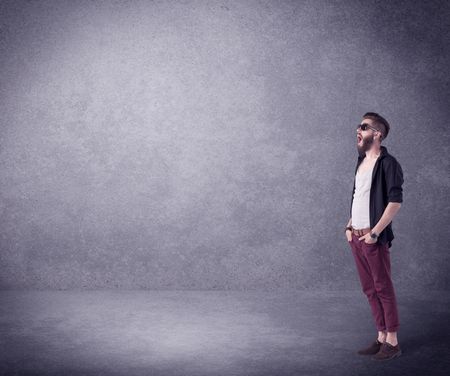 A hipster guy in stylish clothes shouting in front of an empty urban concrete wall background concept