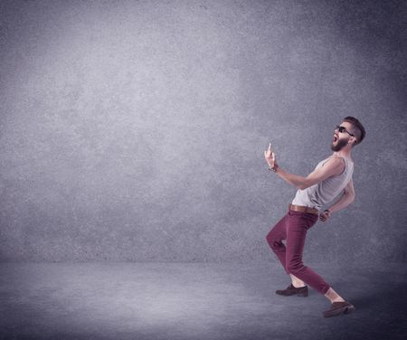 A hipster guy in stylish clothes shouting in front of an empty urban concrete wall background concept