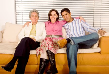 hispanic family portrait sitting on a sofa at home in a modern interior environment
