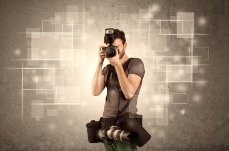 A hobby photographer with professional camera gear and belt shooting in front of brown sepia urban concrete wall full of glowing square illustrations concept