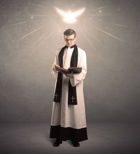 A holy priest reading a prayer from the holy bible with illustrated glowing angel above his head concept.