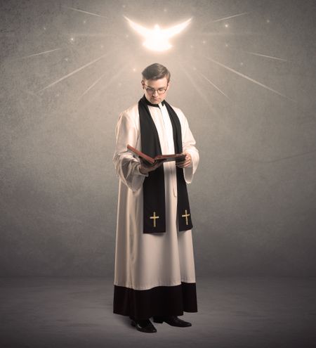 A holy priest reading a prayer from the holy bible with illustrated glowing angel above his head concept.