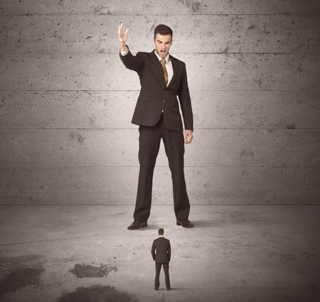 Huge angry business guy looking at small coworker concept on background