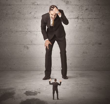 Huge angry business guy looking at small coworker concept on background