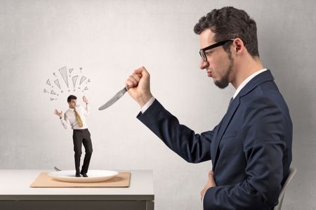 Huge businessman starting to eat small businessman