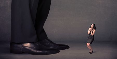 Huge legs with small businesswoman standing in front concept on background
