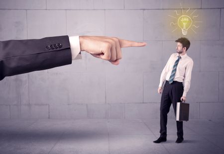 A huge ordering hand pointing at scared and confused businessman with a good idea illustrated by a drawn glowing light bulb concept