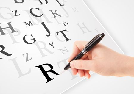 Human hand writing various letters on white plain paper