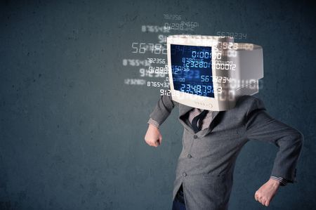 Human monitor pc calculating computer data on a blue screen