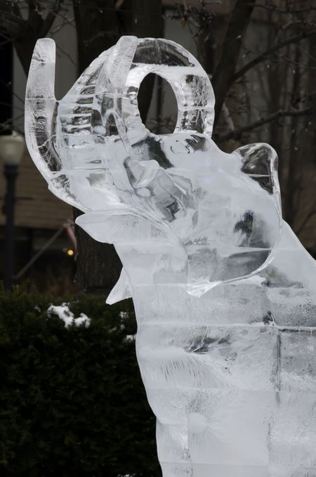 Ice sculpture of elephant or mastodon, partial view, in public square -- detail of winter ice festival in northern Illinois