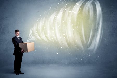 An illustrated powerful whirlwind escaping, coming out of empty paper box held by elegant businessman concept.