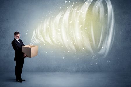 An illustrated powerful whirlwind escaping, coming out of empty paper box held by elegant businessman concept.