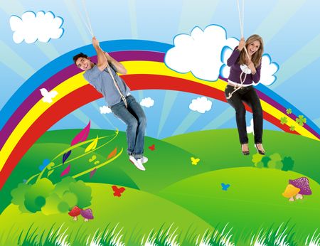 illustration of a beautiful couple having fun over a colourful rainbow