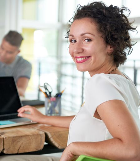 Image of a succesful casual business woman using laptop during meeting