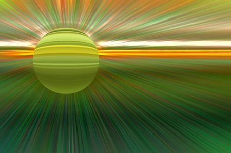 Imaginary abstract of a banded planet with a faint halo in front of a source of radially blurred energy beams, for themes of otherworldliness, cosmic events, or alternate reality (one of a series)