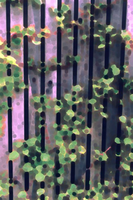 Impressionistic abstract of climbing hydrangea on wooden fence in spring garden, with light green pastels overlapping dark stripes, for illustration and background