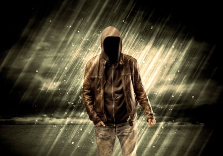 An incognito hooded stalker standing in the rain with his back in front of dark scary landscape concept
