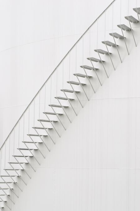 Industrial abstract: stairway curving along white exterior of petroleum refinery