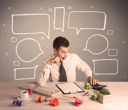 An intelligent elegant business person sitting at a desk and working with drawn empty text bubbles, boxes around him concept
