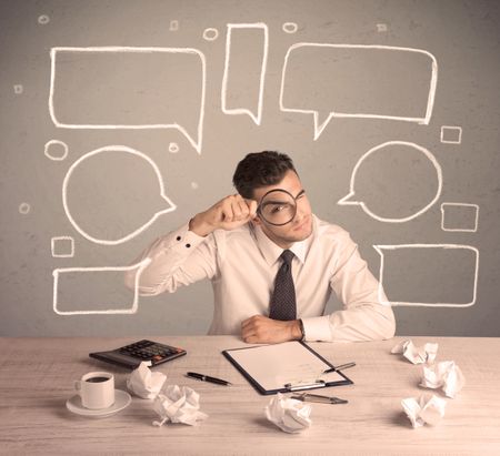 An intelligent elegant business person sitting at a desk and working with drawn empty text bubbles, boxes around him concept