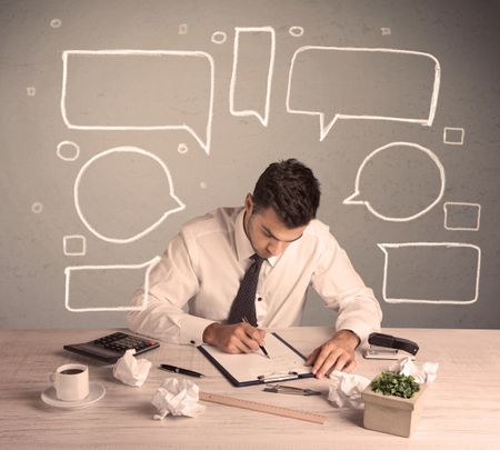 An intelligent elegant business person sitting at a desk and working with drawn empty text bubbles, boxes around him concept