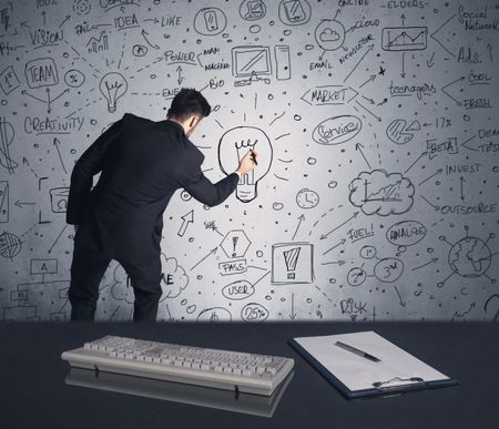 An intelligent office worker drawing strategy ideas and future plan keywords on wall at a brainstorming meeting in office concept