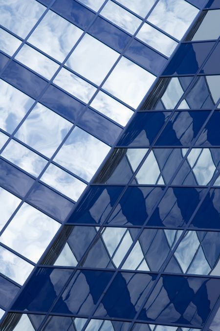 Intersection of two skyscraper walls that reflect a cloudy sky