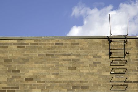 Iron rungs near end of exterior brick wall, a series of steps to roof and sky