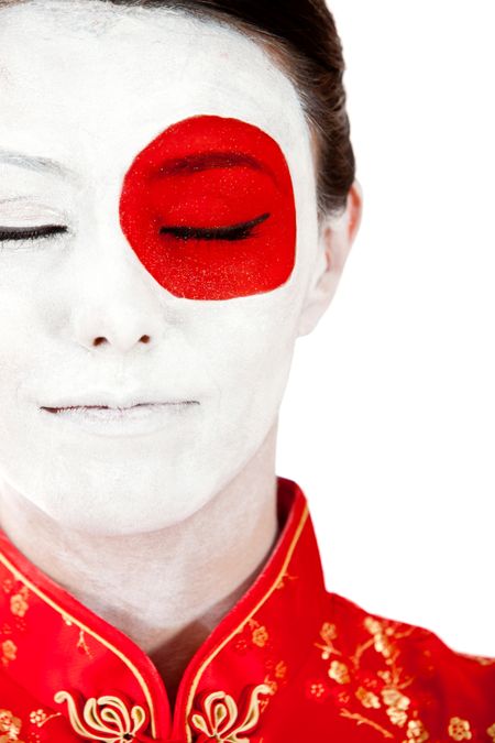 Japanese woman in Asian outfit with the flag painted on her face