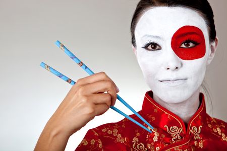 Japanese woman with chopsticks and the flag painted on her face