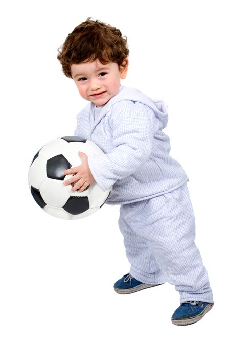 little kid with a football isolated over a white background