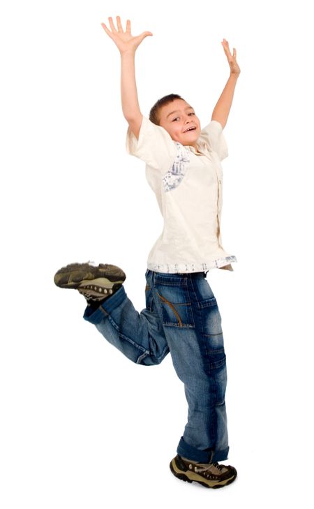 kid having joy running and jumping around - isolated over a white background