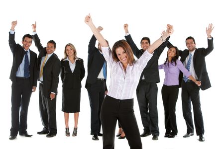Large and very happy business group isolated over white