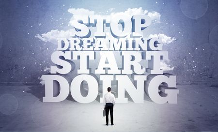 A lazy sales person standing in emty space with huge block letters illustration saying stop dreaming start doing and clouds concept