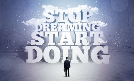 A lazy sales person standing in emty space with huge block letters illustration saying stop dreaming start doing and clouds concept