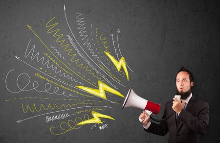 Leader guy shouting into megaphone with hand drawn lines and arrows on grungy background