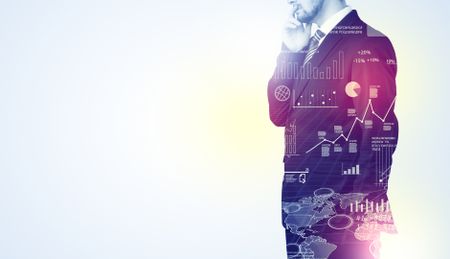 Leader man standing and thinking with graphs, charts, diagrams on the background
