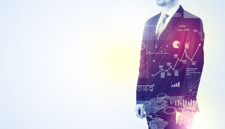 Leader man standing and thinking with graphs, charts, diagrams on the background